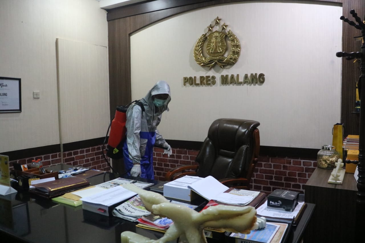 Pada sore (18/03/2020) Polres malang juga melakukan langkah – langkah taktis dengan penyemprotan cairan desinfektan di TK bhayangkari, dan Mako Polres Malang yang di lakukan oleh urusan kesehatan (URKES) dan di pimpin langsung oleh PaurKes polres malang Dr Anita.