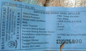 Menurut sumber yang enggan disebut namanya bahwa, bibit durian tersebut menggunakan label PBH Tunas Harapan dengan nama pemilik Andi ical yang beralamatkan kabupaten sinjai provinsi sulawesi selatan.