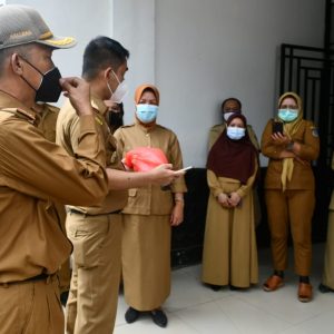Sekda yang mewakili Bupati Koltim, bersama Asisten I Setda Koltim Arisman SP, menyambangi kantor-kantor OPD satu persatu sambil membagikan masker yang sudah dikemas dalam kantong plastik.