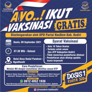 Menurut Drs H. Lutfi Mahmudiono, Ketua DPD Partai NasDem Kabupaten Kediri saat dihubungi lewat whatsApp mengatakan, DPD Partai NasDem Kabupaten Kediri akan melaksanakan vaksinasi gratis bertempat di Balai Badal Pandean, Ngadiluwih.
