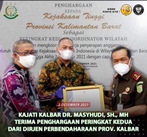 Detik Bhayangkara.com, Kalbar – Kepala Kejaksaan Tinggi Kalimantan Barat Dr. Masyhudi, SH, MH menerima penghargaan peringkat kedua sebagai Koordinator Wilayah dalam Mengkoordinir Kinerja Penyerapan Anggaran Seluruh Satker Lingkup Kejaksaan Republik Indonesia di Wilayah Kalimantan Barat Periode hingga akhir Nopember 2021 dengan capaian 95 % dari Direktorat Jenderal Perbendaharaan Prov. Kalimantan Barat, Kamis, (02 Desember 2021) 09.45 Wib di Balai Petitih Kantor Gubernur Kalbar.