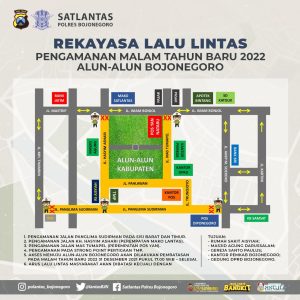 Satuan Lalu Lintas (Satlantas) Polres Bojonegoro melakukan rekayasa arus lalu lintas (Lalin) di kawasan Kota Bojonegoro dan Alun-alun Kota Bojonegoro untuk mengantisipasi kepadatan pada malam perayaan Tahun Baru 2022.
