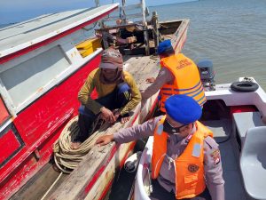 Bripka Sayoko bersama dua anggota lainnya melaksanakan patroli dialogis seputaran Perairan Pulau Laki, dan memberi imbauan dan pesan pesan Kamtibmas kepada masyarakat  yang sedang beraktifitas  di Perairan Tanjung Kait, Selasa (25/01/2022) pagi .
