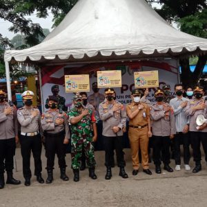 Detik Bhayangkara.com, Tangerang – Kapolresta Tangerang Kombes Pol Zain Dwi Nugroho. SH, SIK Msi. Bersama Pju Polresta Tangerang serta dihadiri Forkompincam Balaraja (Camat Balaraja, Danramil 05 Balaraja dan Kapolsek Balaraja) mengunjungi dan cek kesiapan Posko Kepatuhan Protokol Kesehatan dan Operasi Masker, di Pasar tradisional Sentiong desa Tobat Kecamatan Balaraja Kabupaten Tangerang,  dalam upaya mencegah Penyebaran Masif Omicron di wilayah hukum Polresta dan jajaran sesuai Intruksi Program Kerja Kapolda Banten Membuat Membuat Posko Masker Pro Aktif Bagikan Masker ke Masyarakat dan Edukasi Pencegahan Omicron.