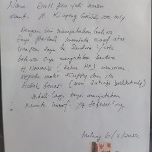 Detik Bhayangkara.com, Kota Malang – Eko Yudi Irawan meminta maaf kepada Pemuda Pancasila Kota Malang, atas pernyataannya yang berisikan fitnah yang dialamatkan kepada Ketua MPC PP Kota Malang H. Agus Sunar Dewabrata, SH.