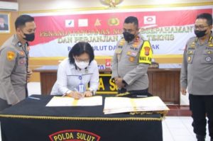 Naskah nota kesepahaman dan perjanjian kerjasama teknis tersebut ditandatangani secara berturut-turut oleh pimpinan masing-masing pihak dan Kapolda Sulut Irjen Pol Mulyatno yang diwakili Wakapolda, Brigjen Pol Johnny Eddizon Isir.