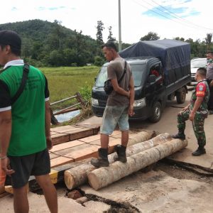 Koramil 1204- 09/Toba bersama warga disini membuat jembatan darurat sementara dari batang pohon kelapa dan kayu untuk kendaraan bisa melintasi.