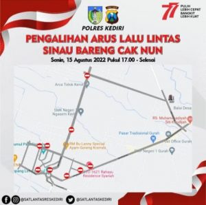 Detik Bhayangkara.com, Kediri – Serangkaian Peringatan HUT RI Ke-77 di Kabupaten Kediri sudah dimulai. Salah satunya adalah Sinau Bareng MH. Ainun Nadjib. Pada kegiatan tersebut, Dinas Perhubungan akan melakukan pengalihan arus di kawasan Simpang Lima Gumul (SLG).