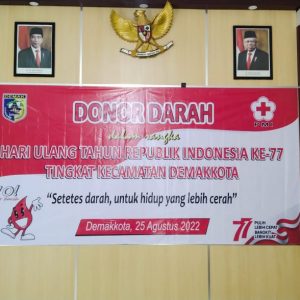 Detik Bhayangkara.com, Demak – Dalam rangka memperingati HUT RI ke – 77 Sinergitas antara Kantor Kecamatan Demak bersama Koordinator Wilayah ( Korwil ) Bidang Pendidikan dan Kebudayaan Kecamatan Demak, Kabupaten Demak gelar Donor Darah, yang bertempat di Aula Kantor Kecamatan Demak yang beralamatkan di jl. Sultan Fatah No.16 Kampung Bogorame, Kecamatan Demak, Kabupaten, Jawa Tengah 59511, Kamis ( 25/8/2022 ), 08.30- 11.25 WIB.