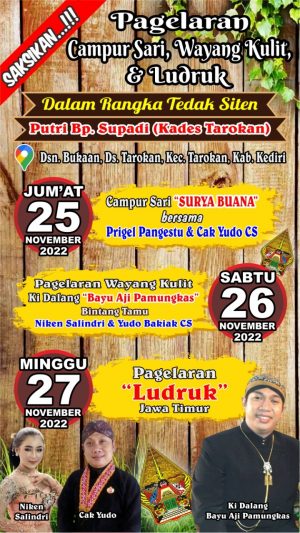 Lanjut “Sultan Kediri” yang juga menjabat Kepala desa (kades) Tarokan tersebut menjelaskan, setelah pagi pembagian paket sembako malamnya diadakan hiburan rakyat yakni Campur sari dari group Surya Buana dengan Prigel Pangestu dan Cak Yudo Cs. Hari berikutnya, Sabtu (26/11/2022) dilanjutkan dengan acara “Sebar Uang dan Tedhak Siten”, pukul 14.00 wib.