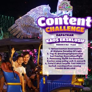 Untuk Content Challenge ini, adapun syarat dan ketentuannya sebagai berikut, Upload konten keseruanmu di Wahana Paradise Of Light, Tag IG @malangnightparadise beri hastag #paradiseoflight, Pemenang dipilih bersarkan Konten yang paling unik & menarik, Total 5 akun terpilih Tiap Minggu akan mendapatkan masing – masing 1 Kaos Eksklusif.