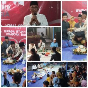 Dalam malam tirakatan di Rabu malam atau malam kamis ini diramu oleh semua panitia HUT RI ke -78 yang bersinergi dengan Sunardi selaku ketua RT bersama pengurus dan warga yang simpatisan, beberapa hidangan nasi tumpeng dan kudapan yang dikemas oleh ibu -ibu Dawis secara kompak,dan dua dos snack masing – masing disediakan kepala keluarga sebagai bukti kebersamaan dan gotong – royong warga, serta rasa syukur kepada Allah SWT dengan memanjatkan doa bersama khususnya warga RT.01 RW.12 Krapyak Bintoro Demak yang dipandu oleh Mei Nurhayati,S.Pd.yang berperan sebagai pembawa acara dan ditutup dengan doa bersama oleh Ustad Wagisan