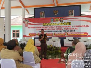Detik Bhayangkara.com, Nganjuk – Bertempat di Balai Desa Rowomarto Kecamatan Patianrowo Kabupaten Nganjuk digelar Sosialisasi Ketentuan Peraturan Perundang Undangan Di Bidang Cukai Hasil Tembakau Kabupaten Nganjuk Tahun 2023, Senin (16/10/2023) 08.30 wib.