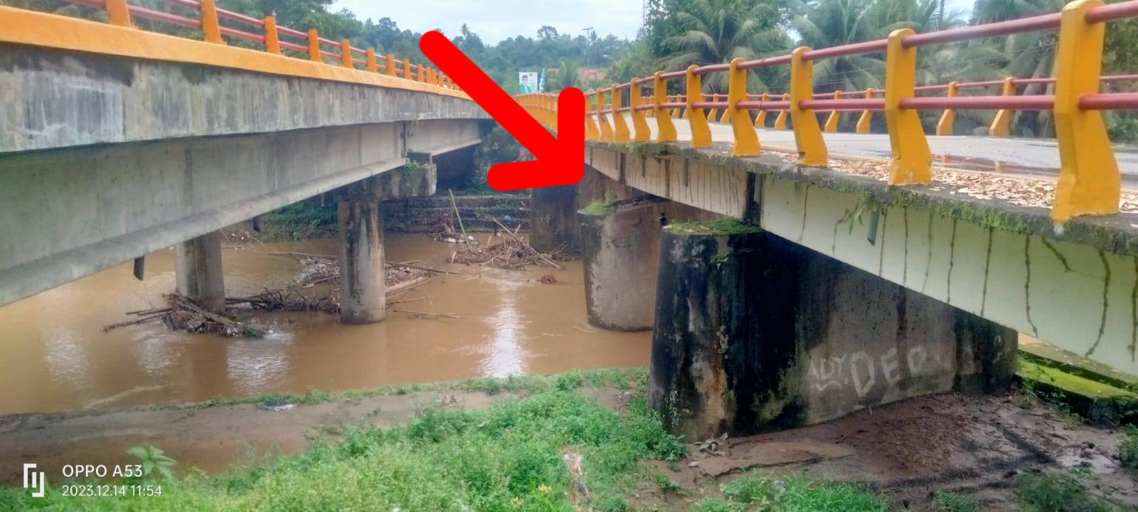 aliran sungai yang deras karena intensitas hujan yang tinggi mengakibatkan pilar jembatan miring karena scouting, (14/12/2023).