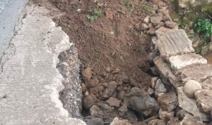 akibat miringnya Jembatan tersebut setelah dilalui mobil fuso bermuatan alat berat dan pengangkut material tanah.