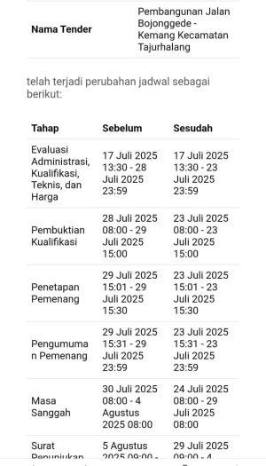 Pada laman dimaksud terlihat bahwa dilakukan perubahan jadwal yang menimbulkan kekagetan untuk banyak penyedia yang mengikuti Lelang dimaksud, yakni pada Tanggal 23 Juli dilakukan Tiga Tahap Lelang sekaligus ; Pembuktian Kualifikasi (jam 08.00 sd 15.00), Penetapan Pemenang (Jam 15.01 sd 15.30), Pengumuman Pemenang (Jam 15.31 sd 23.59).