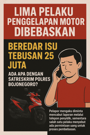 Namun, situasi tersebut mengundang tanda tanya publik. Lima orang terduga pelaku yang sempat diamankan penyidik dikabarkan dibebaskan pada Kamis (27 November 2025), setelah pelapor menerima telepon dari salah satu penyidik Unit Pidum Satreskrim Polres Bojonegoro atas nama Arif, yang disebut meminta agar korban mencabut laporan supaya sepeda motor dapat dikembalikan.